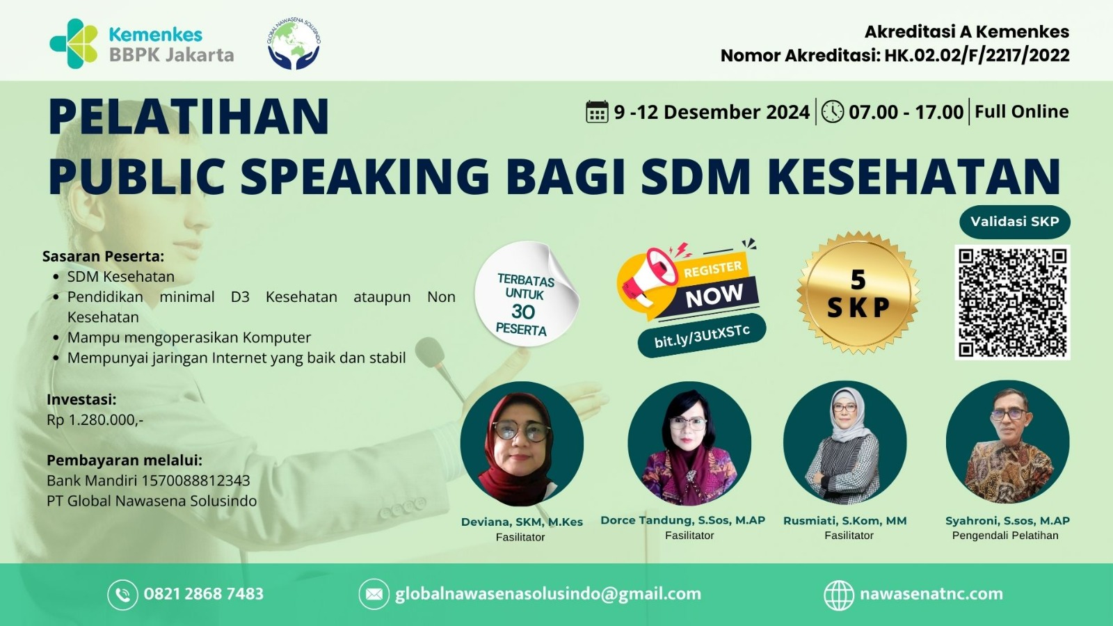 Dengan ini kami sampaikan bahwa Global Nawasena Solusindo (GNS) bekerjasama dengan Balai Besar Pelatihan Kesehatan (BBPK) Jakarta Mengadakan Pelatihan Public Speaking bagi SDM Kesehatan, yang akan dilaksanakan pada: